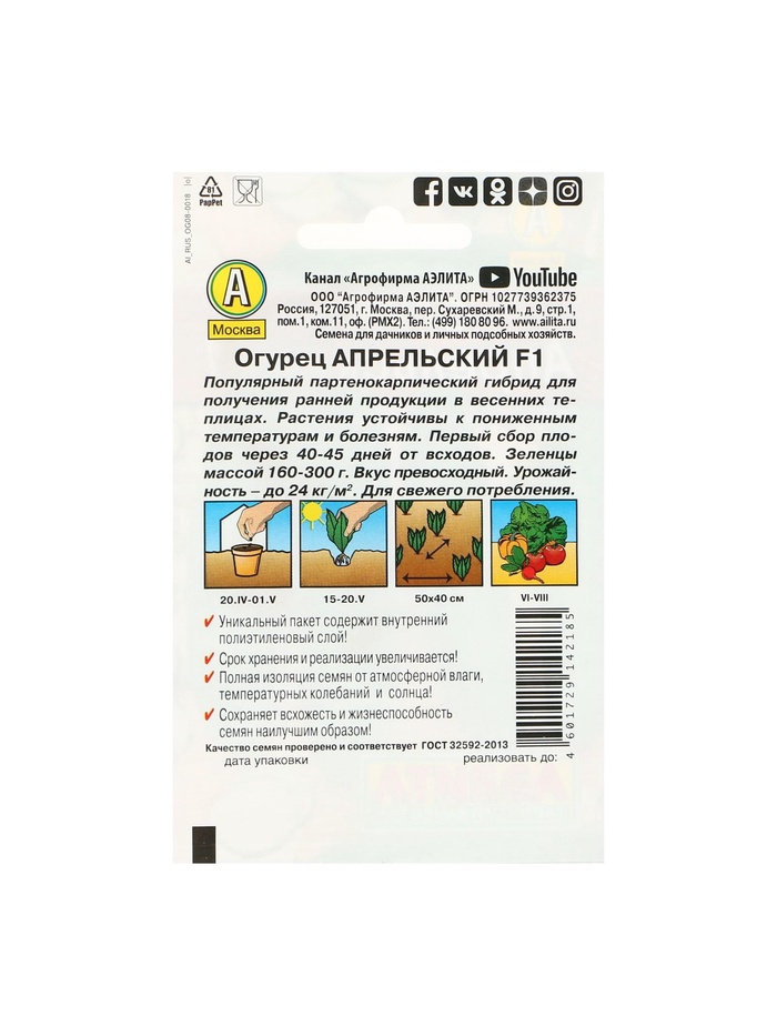 Семена огурца "Апрельский" "Лидер", F1, 10 шт. — Характеристики