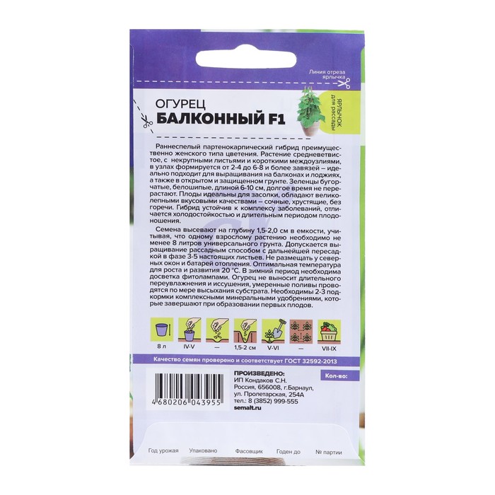 Раннеспелый партенокарпический гибрид преимущественно женского типа цветения. Растение средневетвистое, с некрупными листьями и короткими междоузлиями, в узлах формируется от 2-4 до 6-8 и более завязей - идеально подходит для выращивания на балконах и лоджиях, а также в открытом и защищенном грунте. Зеленцы бугорчатые, белошипые, длиной 6-10 см, долгое время не перерастают. Плоды идеальны для засолки, обладают великолепными вкусовыми качествами - сочные, хрустящие, без горечи. Гибрид устойчив к комплексу заболеваний, отличается холодостойкостью и длительным периодом плодоношения. Семена высевают на глубину 1,5-2,0 см в емкости, учитывая, что одному взрослому растению необходимо не менее 8 литров универсального грунта. Допускается выращивание рассадным способом с дальнейшей пересадкой в фазе 3-5 настоящих листьев. Не размещать у северных окон и батарей отопления. Оптимальная температура для роста и развития 20 °С. В зимний период необходима досветка фитолампами. Огурец не выносит длительного переувлажнения и иссушения, умеренные поливы проводятся по мере высыхания субстрата. Необходимы 2-3 подкормки комплексными минеральными удобрениями, которые завершают при образовании первых плодов.