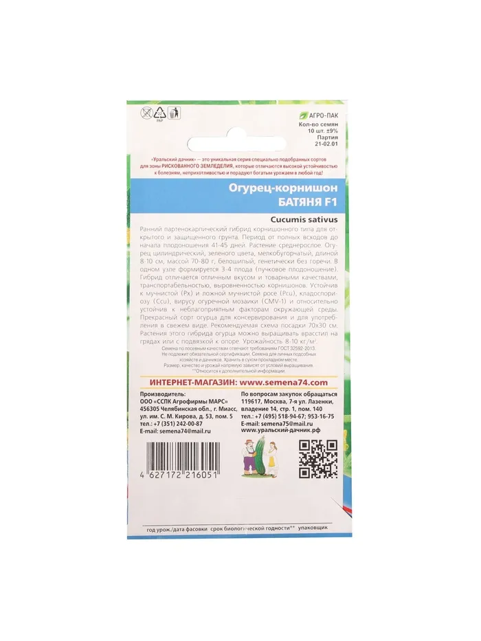 Ранний партенокарпический гибрид корнишонного типа для открытого и защищённого грунта. Период от полных всходов до начала плодоношения 41-45 дней. Растение среднерослое. Огурец цилиндрический, зелёного цвета, мелкобугорчатый, длиной 8-10 см, массой 70-80 г, белошипый, генетически без горечи. В одном узле формируется 3-4 плода (пучковое плодоношение). Гибрид отличается отличным вкусом и товарными качествами, транспортабельностью, выровненностью корнишонов. Устойчив к мучнистой (Px) и ложной мучнистой росе (Pcu), кладоспориозу (Ccu), вирусу огуречной мозаики (CMV-1) и относительно устойчив к неблагоприятным факторам окружающей среды. Прекрасный сорт огурца для консервирования и для употребления в свежем виде. Рекомендуемая схема посадки 70х30 см. Растения этого гибрида огурца можно выращивать врасстил на грядах или с подвязкой к опоре. Урожайность 8-10 кг/м2.