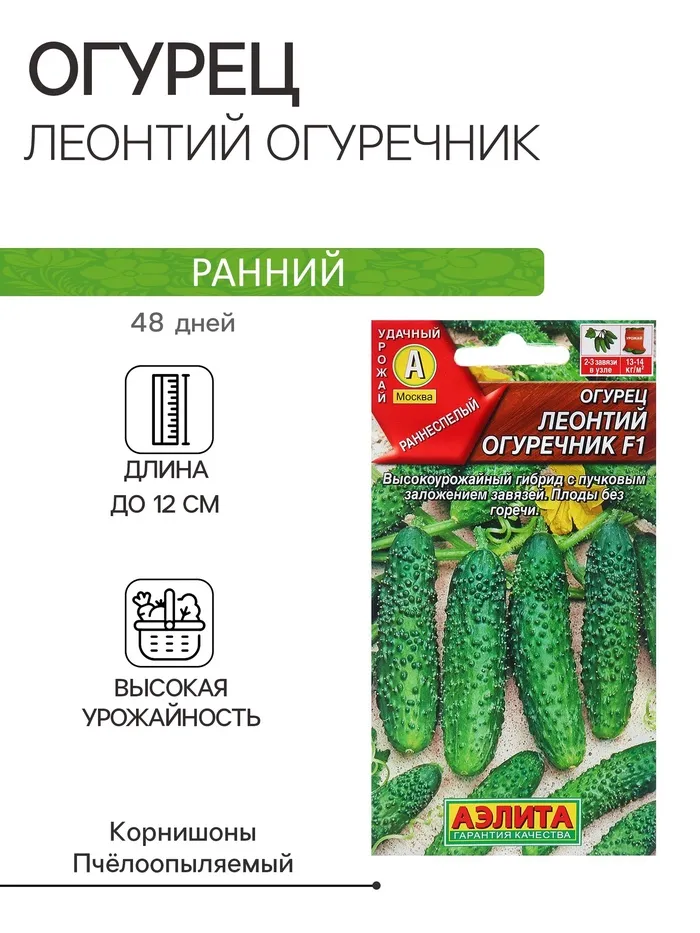 Ультраранний, высокоурожайный партенокарпический гибрид. Первые огурчики снимают через 41-43 дня после всходов. Для пленочных укрытий и открытого грунта. Плодоношение дружное, в каждом узле формируется 5-8 завязей. Зеленцы короткие, массой 100-120 г. Плоды не перерастают и не горчат. Подходит для выращивания пикулей и корнишонов. Урожайность – 6-8 кг с растения.