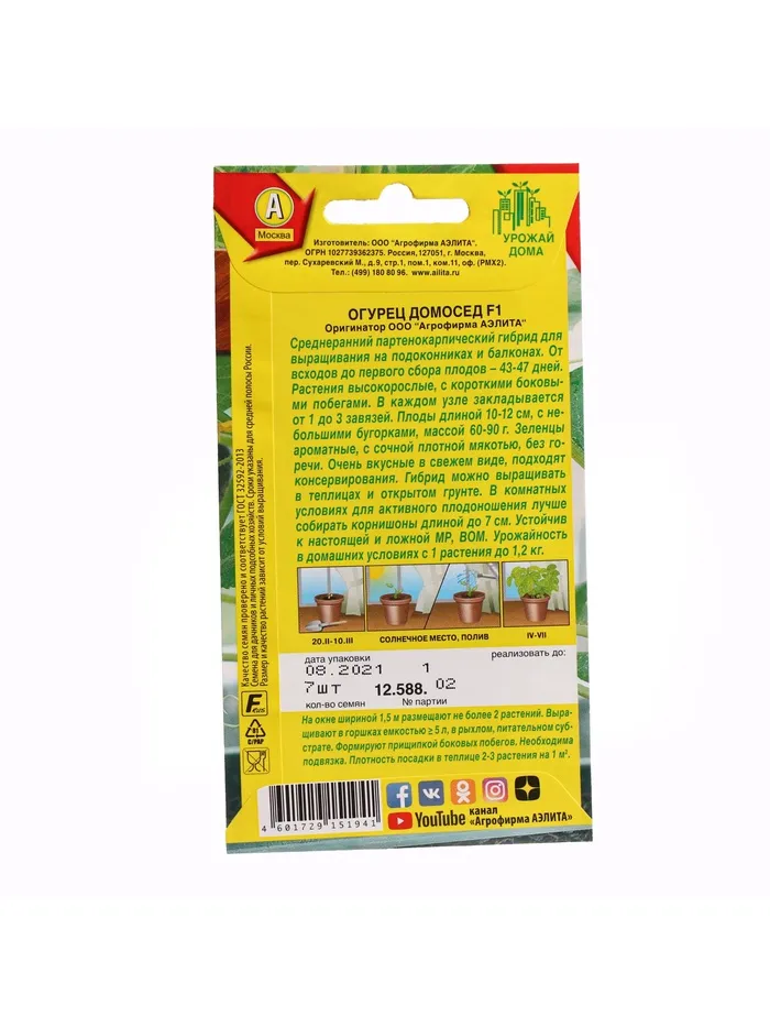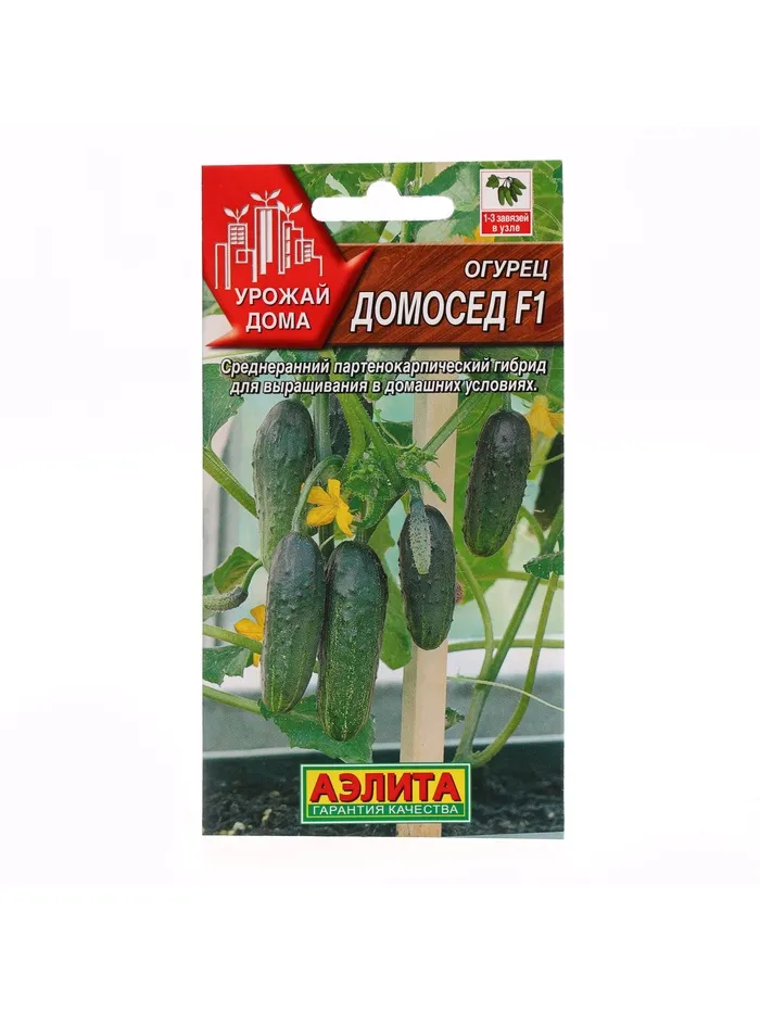 Домосед F1 - раннеспелый 100% партенокарпический гибрид с женским типом цветения.При посеве в осенне-зимний период, от всходов до начала плодоношения 56-61 день, в весенне-летний при весеннем посеве 43-45 дней.Плод цилиндрический, с гладкой, глянцевой поверхностью, длиной 14 см, диаметром 3,5-4 см. Генетически свободен от горечи. Предназначен для потребления в свежем виде.Пригодный для комнатной культуры гибрид.Может выращиваться круглый год, как в зимне-весенний, так и в весенний и летне-осенний культурообороты.Вынослив к затенению.Очень красивые и вкусные огурчики.Семена высевают в горшки, объемом 10-15 литров, со специально подготовленной почвой (2 части перегноя, 1 часть дерновой земли, 1 часть песка) на глубину 1,5 см. Температура воздуха и почвы должна быть 20-23°С. Грунт должен быть равномерно увлажнен (не допускается перелив и закисание почвы). После появления всходов, в процессе роста растений, не допускать снижение температуры ниже 14°С. Необходимо опрыскивание теплой водой один раз в день. Во время вегетации необходимы подкормки полным минеральным удобрением с преобладанием азота и содержащие микроэлементы. Прекрасные результаты дает дополнительная подсветка растений в зимнее время. Во время плодоношения необходимо регулярно снимать зеленцы, что стимулирует появление новых завязей.
