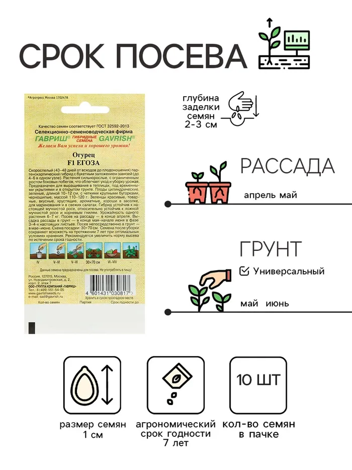 Посев: на рассаду в конце апреля. Помещайте молодые растения в почву с конца мая по начало июня в фазе 3–4-х настоящих листьев. Производите посев непосредственно в грунт в мае–июне. Схема посадки: 30 × 70 см.