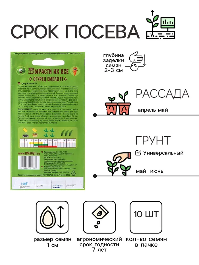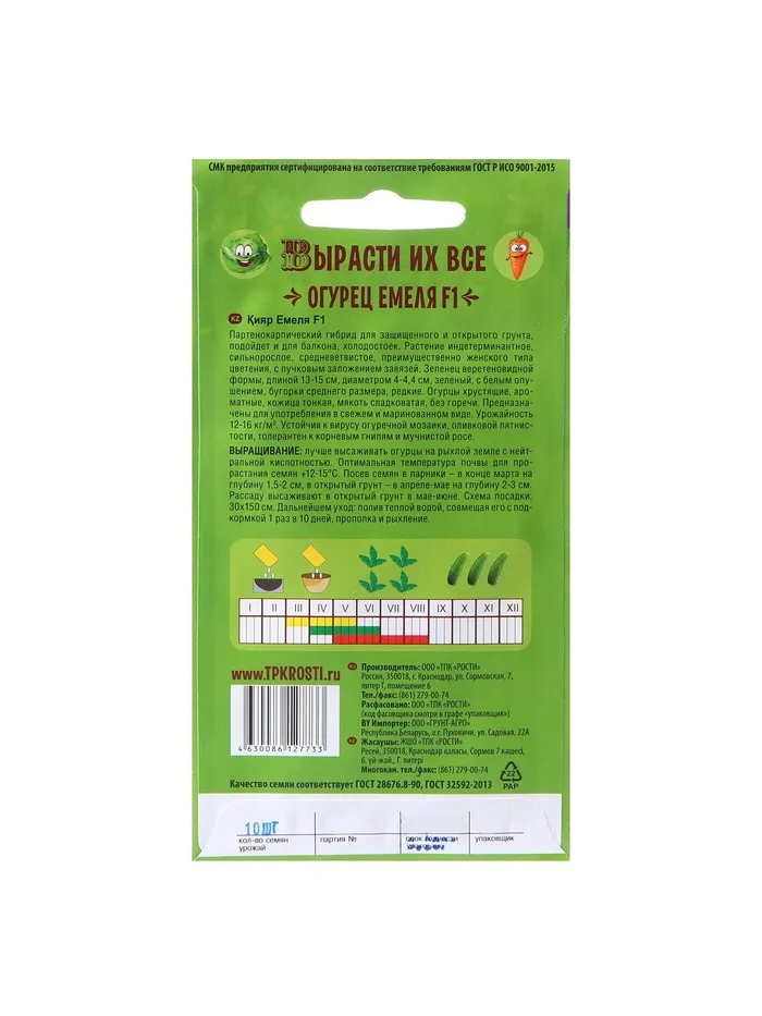 Огурец F1 Емеля - скороспелый урожайный партенокарпический гибрид женского или преимущественно женского типа цветения для весенних теплиц, тоннелей, открытого грунта. Растения сильнорослые, с укороченными междоузлиями; ветвление среднее или ниже среднего. Зеленцы интенсивно-зеленого цвета, крупнобугорчатые белошипые, овально-цилиндрической формы, длиной 13-15 см, очень высоких вкусовых качеств, хороши для засолки и консервирования. Для гибрида характерны дружная отдача урожая и повышенная холодостойкость. Урожайность F1 Емеля, несмотря на более короткие зеленцы, держится на уровне гибридов Зозуля и Апрельский, а в годы с ненастным летом превосходит их.