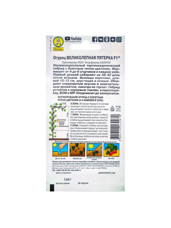 «Великолепная пятёрка» — это ультраранний и высокоурожайный партенокарпический сорт для плёночных укрытий и открытого грунта. Плодоношение начинается на 38–42 день от всходов. Растение отличается высокой устойчивостью к кладоспориозу, вирусу огуречной мозаики, настоящей мучнистой росе и корневой гнили.