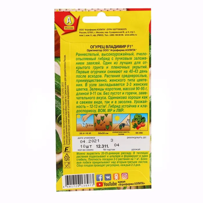 Скороспелый пчелоопыляемый гибрид, от полных всходов до плодоношения не более 40-43 дней. Гибрид характеризуется умеренной силой роста, большая часть энергии растения идет на плодообразование. Растения насыщены женскими цветками, в узле закладывается по 2-3 завязи; устойчивы к вирусу мозаики огурца, к настоящей мучнистой росе и толерантны к ложной, – что и определяет основную черту гибрида – высокую урожайность. Плоды темно-зеленые, мелкобугорчатые, белошипые, средней длины (соотношение длины к ширине 3,1:1), с отличными вкусовыми качествами. Использование зеленцов - универсальное: огурчики хороши и в свежем, и в консервированном виде. С гибридом Владимир F1 вы не будете испытывать недостатка в огуречной продукции.
