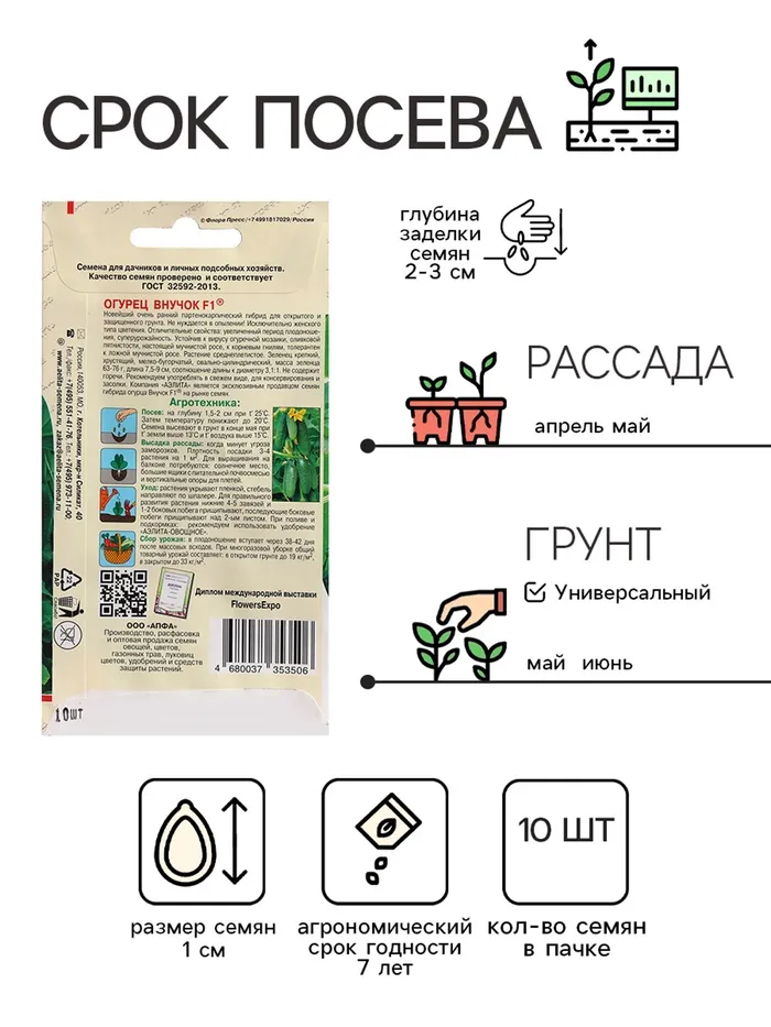 Очень ранний партенокарпический гибрид для открытого грунта, пленочных и стеклянных теплиц, женского типа цветения (ранее в описании: «самоопыляемый», правильный термин: «партенокарпический» - завязывает плоды без опыления). Отличительные свойства: увеличенный период плодоношения, высокая урожайность и товарность плодов. Устойчив к основным болезням огурца: вирусу огуречной мозаики, настоящей мучнистой росе, оливковой пятнистости, корневым гнилям, толерантен к ложной мучнистой росе. Растение среднеплетистое. Зеленцы корнишонного типа с маленькими семенными камерами, мелко-бугорчатые, с белым, плотным опушением, овально-цилиндрической формы, крепкие, хрустящие. Масса зеленца 63-76 г, длина 7,5-9,0 см, соотношение длины к диаметру 3,1:1. Отличается великолепными вкусовыми качествами в свежем виде, при консервировании и засолке. Горечи не содержит.