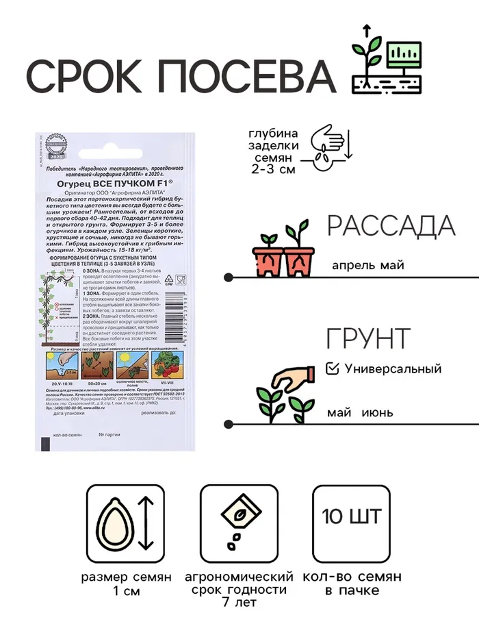Партенокарпический, высокоурожайный гибрид с длительным плодоношением. Рекомендуется для открытого грунта, временных пленочных укрытий и теплиц. По срокам созревания – среднеранний, от полных всходов до первого сбора плодов 46-50 дней. Растения обладают высокой устойчивостью к грибковым инфекциям – пероноспорозу и кладоспориозу. Проявляют склонность к букетному заложению завязей – при хорошем уходе формируют от 2 до 4 огурчиков в узле. Зеленцы овально-цилиндрические, мелкобугорчатые, белошипые, массой 70-90 г, длиной 9-12 см, соотношение длины и диаметра плода 3,3:1. Вкус отличный, без горечи. Использование универсальное – свежее потребление и консервирование.