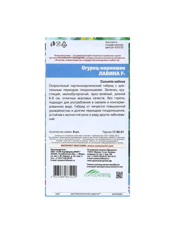 Скороспелый (38-40 дней от всходов до плодоношения) партенокарпический гибрид для пленочных теплиц и открытого грунта. Один из лучших для ранних продаж. Первый на грядке порадует богатым урожаем корнишонов высокого качества. В узле в основном по 2 завязи (до 3-4-х). Плод 12 см, цилиндрический, темно-зеленый со слабыми светлыми полосками, белошипый. Бугорки среднего размера, расположены довольно часто. Гибрид устойчив к настоящей мучнистой росе, оливковой пятнистости и корневым гнилям, толерантен к пероноспорозу. Плоды используют для приготовления свежих салатов, засолки и маринования. Посев на рассаду — в конце апреля. Высадка рассады в грунт — в конце мая – начале июня в фазе 3-4-х настоящих листьев. Посев непосредственно в грунт – в мае – июне. Схема посадки: 30х70 см.