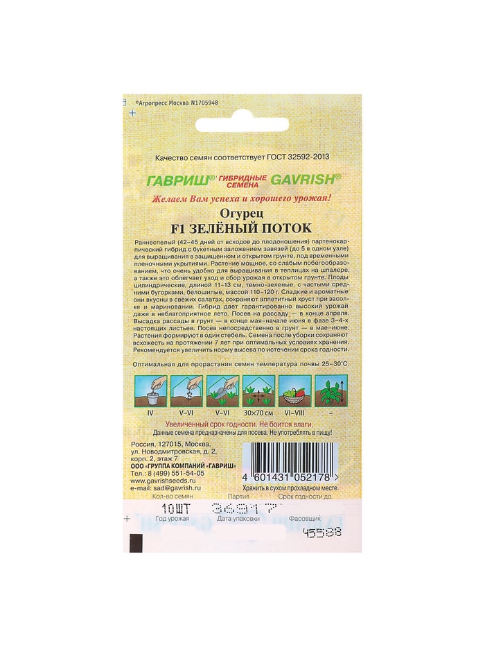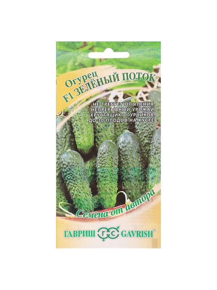 «Зелёный поток» — это раннеспелый партенокарпический гибрид с букетным заложением завязей, у которого период от всходов до плодоношения составляет 42–45 дней. Гарантированно даёт высокий урожай даже в неблагоприятное лето. Предназначен для культивирования в защищённом и открытом грунте, а также под временными плёночными укрытиями.