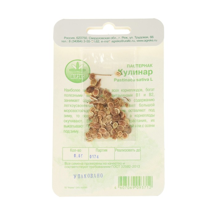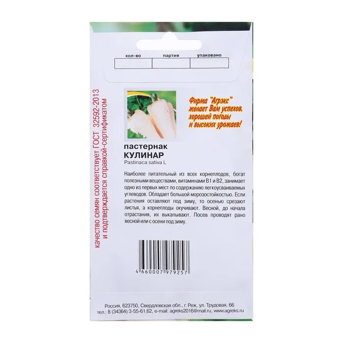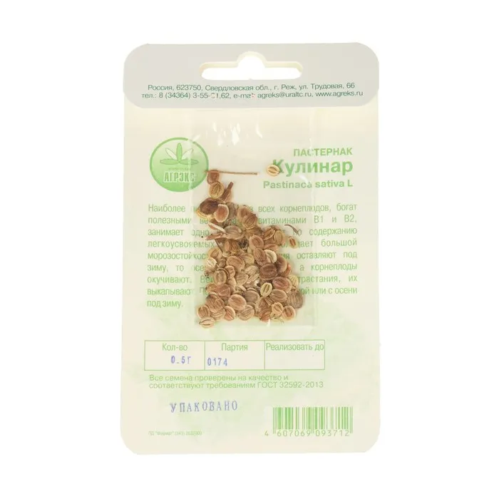 Среднеранний. Период от полных всходов до начала технической спелости 80-85 дней. Розетка листьев прямостоячая. Лист зеленый, листовые дольки остро надрезанные, черешок светло-зеленый. Корнеплод конусовидно-сбежистой формы, у основания округло-сплюснутый, белый, поверхность неровная, чечевички сильно развиты, головка средняя, выпуклая, мякоть грубая, малосочная. Корнеплод полностью погружен в почву. Масса корнеплода 143 г. Урожайность корнеплодов 2,97 кг/м2. Среди других корнеплодов считается самым холодостойким и морозостойким растением, семена начинают прорастать при температуре 5-6 °C. Всходы появляются на 15-20-й день, переносят заморозки до -5 °C, взрослые растения до -7...-8 °C. Размножается семенами. Глубина заделки семян 2-3 см. Выращивается безрассадным способом. Рекомендуется для использования в домашней кулинарии и консервировании. Пастернак кладут в супы или отвары, борщи, употребляют в качестве гарнира к мясным блюдам. Кроме того, пастернак рекомендуют для восстановления сил у выздоравливающих людей, а также как сосудорасширяющее средство. Листья пастернака применяют в дерматологии. Отвар корней и настой травы пьют при кашле. Схема посева 25x40 см.