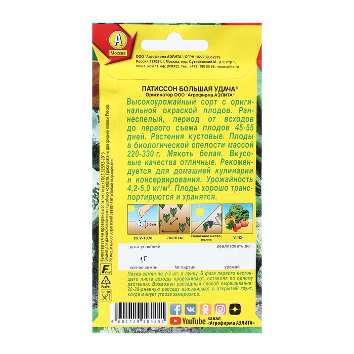 Новый, раннеспелый сорт. Период от всходов до первого съема плодов 45-55 дней. Растения кустовые. Плоды оригинальной окраски, массой 220-330 г. Мякоть белая, сочная, плотная и нежная. Вкусовые качества продукции отличные. Рекомендуется для домашней кулинарии и консервирования. Урожайность высокая – 4,2-5,0 кг/м2 . Плоды хорошо транспортируются и хранятся.