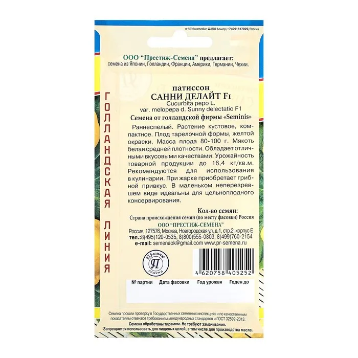 Семена Патиссон "Сани Делайт F1", ц/п, 5 шт. — Характеристики