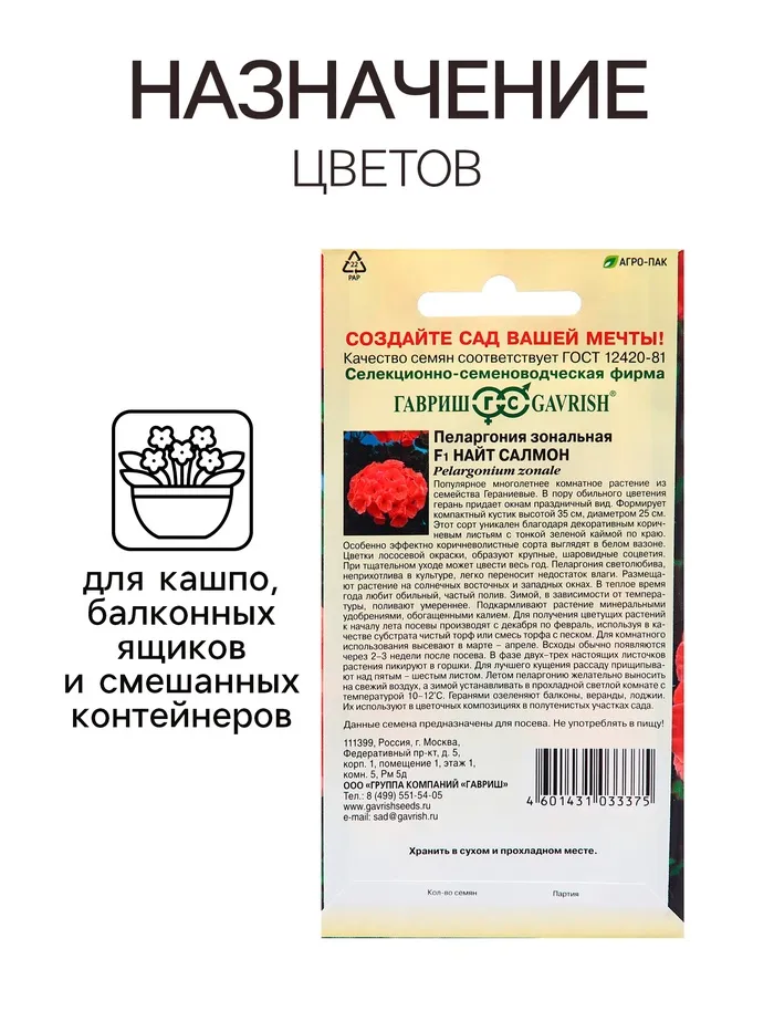 Семена Пеларгония "Найт Салмон", ц/п, F1, зональная, 4 шт — Характеристики