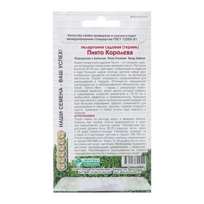 Семена пеларгония садовая «Пинто Королева», 3 шт. — Характеристики