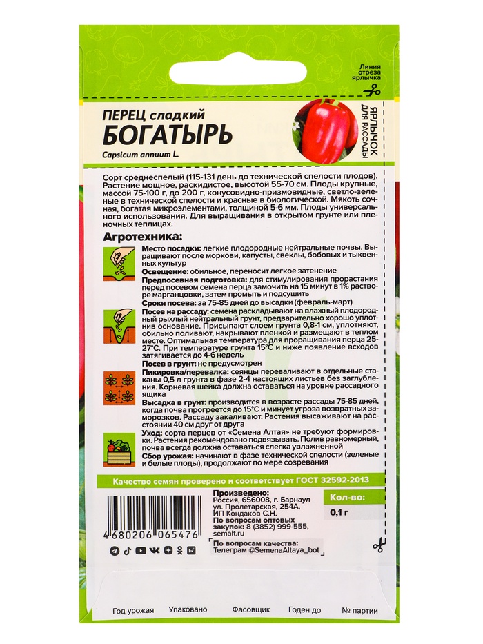 Семена Перец «Богатырь», 0.1 г, «Семена Алтая» — Характеристики