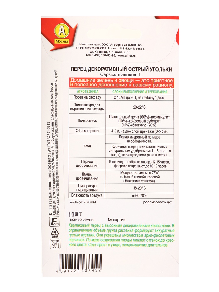 Семена Перец декоративный острый Угольки Зимний огород, Ц/П,10 шт. — Характеристики