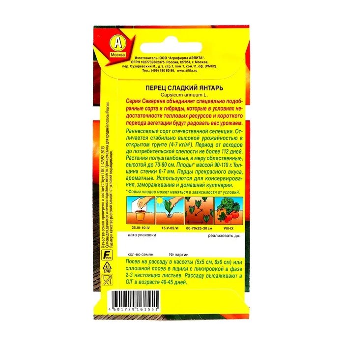 «Янтарь» представляет собой популярный ранний сорт перцев. Предназначен для выращивания с использованием плёночных укрытий. Имеет средние плоды с приятным вкусом и ароматом. Подходит для употребления в сыром виде, жарки, тушения, фарширования и консервирования.