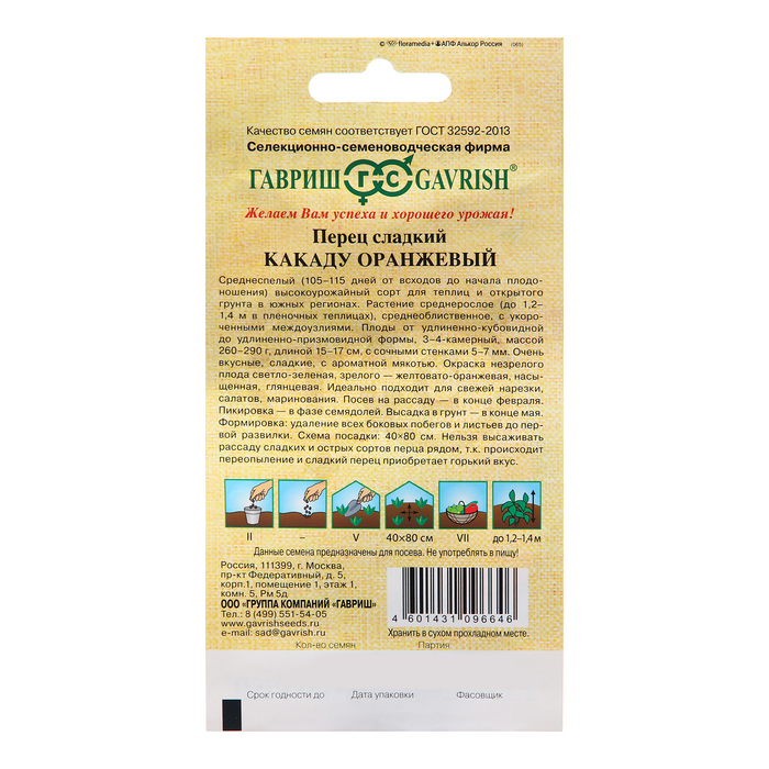 Среднеспелый (105-115 дней от всходов до начала плодоношения) высокоурожайный сорт для теплиц и открытого грунта в южных регионах. Растение среднерослое (до 1,2-1,4 м в пленочных теплицах), среднеоблиственное, с укороченными междоузлиями. Плоды от удлиненно-кубовидной до удлиненно-призмовидной формы, 3-4-камерный, массой 260-290 г, длиной 15-17 см, с сочными стенками 5-7 мм. Очень вкусные, сладкие, с ароматной мякотью. Окраска незрелого плода светло-зеленая, зрелого — желтовато-оранжевая, насыщенная, глянцевая. Идеально подходит для свежей нарезки, салатов, маринования. Посев на рассаду — в конце февраля. Пикировка — в фазе семядолей. Высадка в грунт — в конце мая. Формировка: удаление всех боковых побегов и листьев до первой развилки. Схема посадки: 40х80 см.