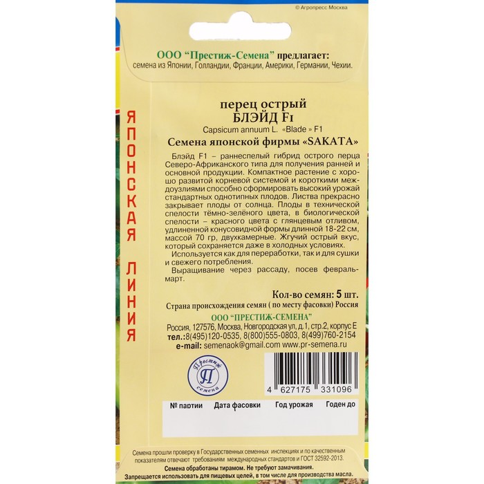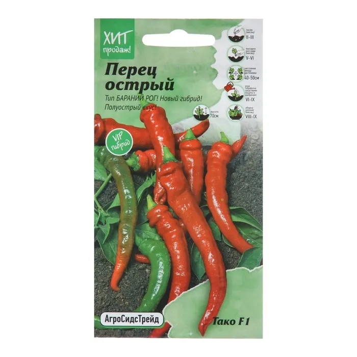 Ранний, урожайный гибрид острого перца для открытого грунта и теплиц. Период от всходов до плодоношения составляет 100-110 дней. Растение компактное, высотой до 60 см. Плоды удлиненно-конусовидные, массой 60-70 г, в технической спелости темно-зеленые, при созревании приобретают красивый красный цвет с глянцевым отливом. Вкус жгуче-острый, сохраняется при выращивании в различных климатических условиях. В кулинарии используют как специю, добавляют в первые и вторые блюда, салаты, является основой многих приправ и соусов. Гибрид устойчив к вершинной гнили. Посев на рассаду — в конце февраля-марте, высадка в грунт— в конце мая-начале июня. Пикировка в фазе 1-2-х настоящих листьев. После высадки у растения удаляют все боковые побеги и листья до первой развилки и подвязывают к опоре. Нельзя высаживать рассаду сладких и острых сортов перца рядом, т.к. происходит переопыление и сладкий перец приобретает горький вкус.
