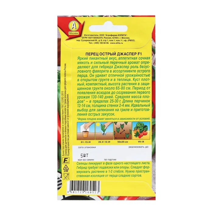 Яркий пикантный вкус, аппетитная сочная мякоть и сильный перечный аромат определяют для гибрида Джаспер роль безусловного фаворита в ассортименте острого перца. Он удивит отличной урожайностью в открытом грунте и в теплице. Куст плотный, компактный, высота растения в защищенном грунте около 65-80 см. Период от появления всходов до созревания первого урожая 130-140 дней. Средняя масса плодов* – в пределах 25-30 г. Длина перчинок 12-14 см, толщина стенки 2-4 мм. Идеальный выбор для запекания на гриле и приготовления острых закусок.