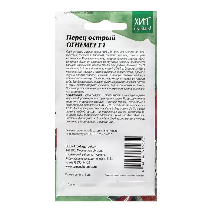 Агротехника: перец острый – теплолюбивая культура, требующая плодородных, хорошо дренируемых почв. На рассаду семена высеивают в середине февраля – начале марта. Оптимальная температура прорастания 20-25 С. Всходы появляются через 12-15 дней, пикируют сеянцы в фазе 1-2-го листа. За 7-14 дней перед высадкой рассады на постоянное место рекомендуется проводить закаливание растений. Схема посадки 30х40 см. Растение формируют в 1 стебель. Уход заключается в поливе, рыхлении и своевременных подкормках.