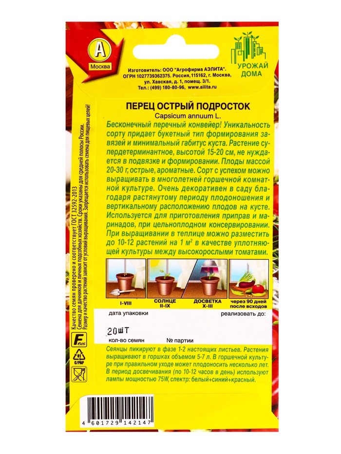 Семена Перец острый Подросток Урожай дома, Ц/П,20 шт. — Характеристики