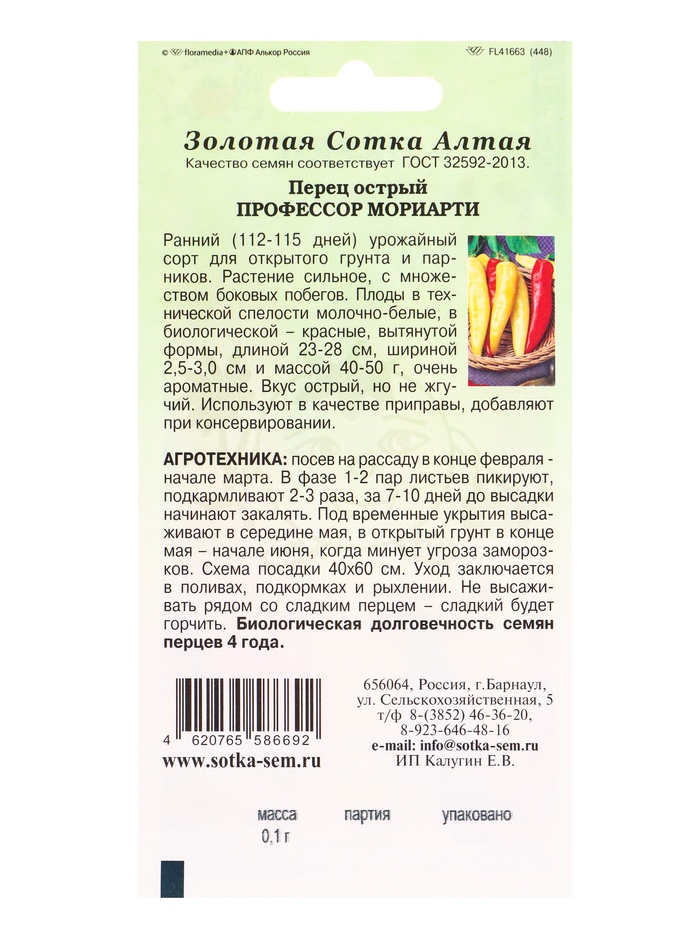 Семена Перец острый «Профессор Мориарти», 0.1 г, раннеспелый, «Золотая Сотка Алтая» — Характеристики