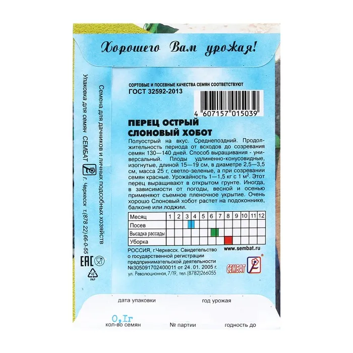 Великолепный крупноплодный сорт для открытого и закрытого грунта. Рост стебля, в зависимости от погодных условий и агротехники, бывает от 50 до 80 см. Плоды удлиненноконусовидные, изогнутые, длиной 19-27 см, в диаметре 2,5-3,5 см, зеленовато-белые, а при созревании семян красные. Плоды ароматные, очень острые, используются в свежем и сушеном виде в качестве приправы к супам, мясным и рыбным блюдам. Очень хорошо «Слоновый хобот» растет на подоконнике, балконе или лоджии.