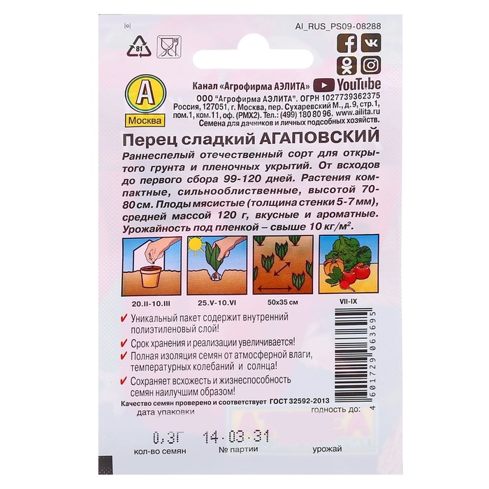 Благодаря внутреннему полиэтиленовому слою пакет не пропускает влагу и увеличивает срок годности семян до 2 лет.