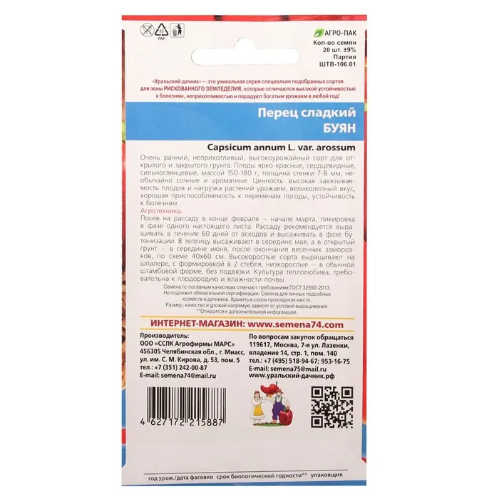 Агротехника: посев на рассаду в конце февраля - начале марта, пикировка в фазе одного настоящего листа. Рассаду рекомендуется выращивать в течение 60 дней от всходов и высаживать в фазе бутонизации. В теплицу высаживают в середине мая, а в открытый грунт - в середине июня, после окончания весенних заморозков, по схеме 40х60 см. Высокорослые сорта выращивают на шпалере, с формировкой в 2 стебля, низкорослые - в обычной штамбовой форме, без подвязки. Культура теплолюбива, требовательна к плодородию и влажности почвы.