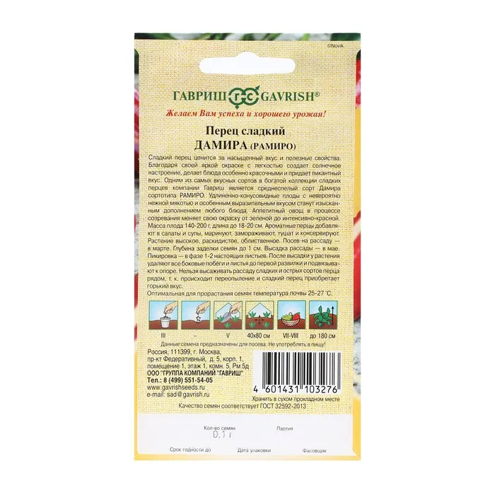 Сладкий перец ценится за насыщенный вкус и полезные свойства. Благодаря своей яркой окраске с легкостью создает солнечное настроение, делает блюда особенно красочными и придает пикантный вкус. Одним из самых вкусных сортов в богатой коллекции сладких перцев компании Гавриш, является среднеспелый сорт Дамира сортотипа Рамиро. Удлиненно-конусовидные плоды с невероятно нежной мякотью и особенным, выразительным вкусом станут изысканным дополнением любого блюда. Аппетитный овощ в процессе созревания меняет свою окраску от зеленой до интенсивно-красной. Масса плода 140-200 г, длина — до 18-20 см. Ароматные перцы добавляют в салаты и супы, маринуют, замораживают, тушат и консервируют. Растение высокое, раскидистое, облиственное. Посев на рассаду — в марте. Глубина заделки семян до 1 см. Высадка рассады — в мае. Пикировка в фазе 1-2 настоящих листьев. После высадки у растения удаляют все боковые побеги и листья до первой развилки и подвязывают к опоре. Нельзя высаживать рассаду сладких и острых сортов перца рядом, т.к. происходит переопыление и сладкий перец приобретает горький вкус.