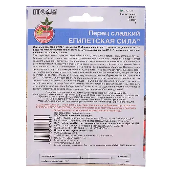 Название сорта складывается из двух составляющих, во-первых, это форма - она правильная треугольная и напоминает пирамиды, плоды некрупные, но увесистые, за счёт толстой и мясистой стенки, толщина которой достигает на некоторых плодах до 1 см, поэтому маленькие плоды набирают достаточно приличный вес - 130-150 г!, а во-вторых, это обильность плодоношения, этих сладкущих плодов будет как из рога изобилия, смотришь на количество плодов и на ум приходит только: «Египетская сила, куда же это всё девать», но с этим проблем не возникнет, так как его можно и свежим в салат, и замораживать, и лечо делать. Сорт выведен в Сибири, без ГМО, имеет высокое содержание витамина «С» в плодах - 198 мг%, чтобы у вас и ваших родных и любимых было крепкое Сибирское здоровье!