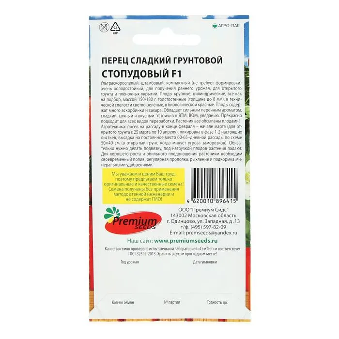 Ультраскороспелый, штамбовый, компактный (не требует формировки) очень холодостойкий, для получения раннего урожая, для открытого грунта и плёночных укрытий. Плоды крупные, цилиндрические, все как на подбор, массой 150-180г, толстостенные (толщина до 8 мм), в технической спелости светло-зелёные, в биологической красные. Плоды содержат много аскорбинки и сахара. Обладает сильным перечным ароматом, сладкий, сочный и вкусный. Устойчив к ВТМ, ВОМ, увяданию. Прекрасно подходит для всех видов переработки. Растения все обсыпаны плодами!