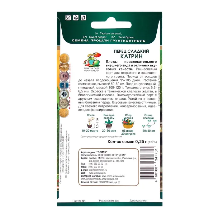 Посадите кусочек солнца в своем саду с семенами сладкого перца «Катрин». Этот сорт — идеальный выбор для тех, кто хочет получить яркий и сладкий урожай. Срок агрономической годности составляет 3 года, так что вы можете спокойно планировать свою садовую деятельность.