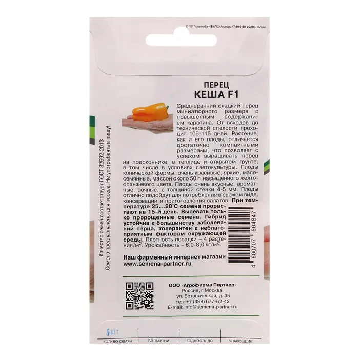 Среднеранний сладкий перец миниатюрного размера с повышенным содержанием каротина. От всходов до технической спелости проходит 105-115 дней. Растение, как и его плоды, отличается достаточно компактными размерами, что позволяет с успехом выращивать перец на подоконнике, в теплице и открытом грунте, в том числе в условиях светокультуры. Плоды конической формы, очень красивые, яркие, малосемянные, массой около 50 г, насыщенного желто-оранжевого цвета. Плоды очень вкусные, ароматные, сочные, с толщиной стенки 4-5 мм. Плоды отлично подойдут для потребления в свежем виде, консервации и приготовления салатов. При температуре 25…28°C семена прорастают на 15-й день. Высевать только пророщенные семена. Гибрид устойчив к большинству заболеваний перца, толерантен к неблагоприятным факторам окружающей среды. Плотность посадки – 4 растения/м². Урожайность – 6,0-8,0 кг/м².