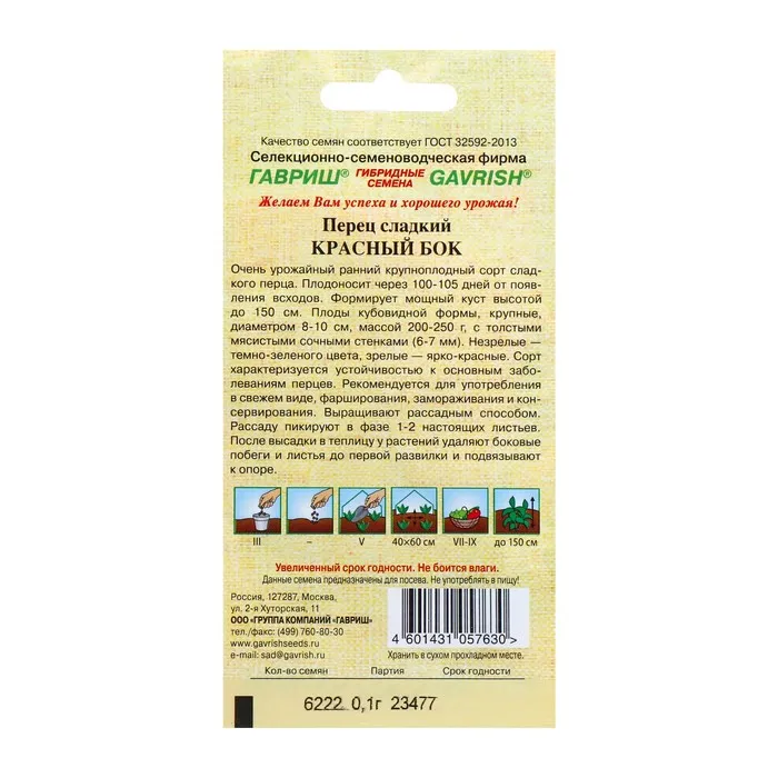 Очень урожайный ранний крупноплодный сорт сладкого перца. Плодоносит через 100-105 дней от появления всходов. Формирует мощный куст высотой до 150 см. Плоды кубовидной формы, крупные, диаметром 8-10 см, массой 200-250 г, с толстыми мясистыми сочными стенками (6-7 мм). Незрелые — темно-зеленого цвета, зрелые — ярко-красные. Сорт характеризуется устойчивостью к основным заболеваниям перцев. Рекомендуется для употребления в свежем виде, фарширования, замораживания и консервирования. Выращивают рассадным способом. Рассаду пикируют в фазе 1-2 настоящих листьев. После высадки в теплицу у растений удаляют боковые побеги и листья до первой развилки и подвязывают к опоре.