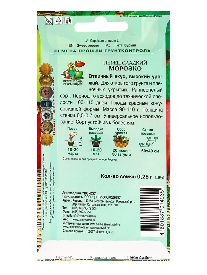 Семена Перец сладкий "Морозко" 0,25 г — Характеристики
