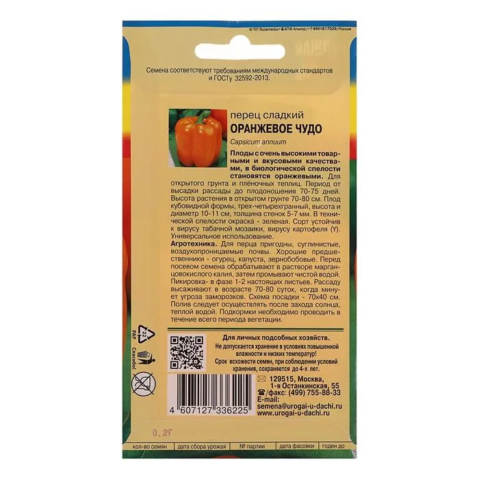 Плоды с очень высокими товарными и вкусовыми качествами, в биологической спелости становятся оранжевыми. Для открытого грунта и плёночных теплиц. Период от высадки рассады до плодоношения 70-75 дней. Высота растения в открытом грунте 70-80 см. Плод кубовидной формы, трех-четырехгранный, высота и диаметр 10-11 см, толщина стенок 5-7 мм. В технической спелости окраска -зеленая. Сорт устойчив к вирусу табачной мозаики, вирусу картофеля (Y). Универсальное использование.