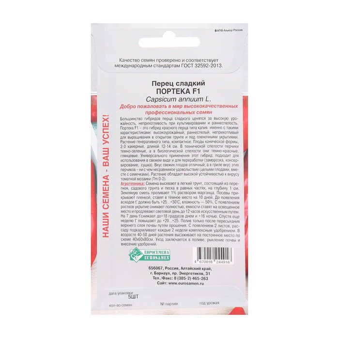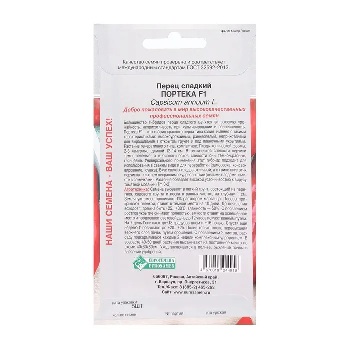 Перец Портека F1 - раннеспелый гибрид для открытого грунта и пленочных укрытий. Плоды удлиненно-конусовидные, в технической спелости темно-зеленые, в биологической – насыщенно-красные. Огородники ценят этот гибрид за следующие качества: устойчивость к вирусу табачной мозаики, бактериозу и изменениям температуры, обильное и продолжительное плодоношение, долго сохраняет товарные качества. Вытянутые конические плоды привлекательного темного красного цвета. Плотная и сочная мякоть отличается превосходным концентрированным сладким вкусом. Перцы одинаково хороши для салатов, горячих блюд, гриля, а также для любых домашних заготовок, сушки и заморозки. Тип – капия. Длина плода 12-14 см, 2-3 камеры.