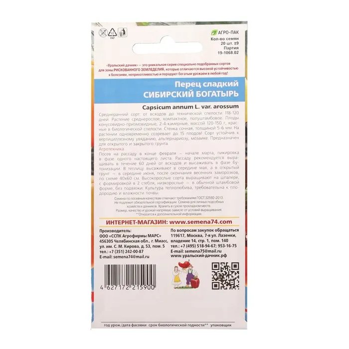 Раннеспелый крупноплодный сорт, устойчивый к заболеваниям. Куст штамбовый, высотой 55-60 см. Плоды кубовидные, темные, мясистые, толстостенные до 6-8 мм, средней массой 200-400 г. Сорт устойчив к заболеваниям. Обзавестись сибирским здоровьем и красотой поможет перец «Сибирский Богатырь». Один богатырский плод восполняет до 278% суточной потребности взрослого человека в витамине С.* Высокое содержание витамина А, 37% от суточной потребности, поможет сохранить молодость, красоту волос, ногтей и кожи.* Высокое содержание бета-каротина, являющегося мощным антиоксидантом, до 40% суточной нормы, способствует уменьшению риска онкологических заболеваний.* Сорт богат кремнием, который поддерживает иммунную систему человека, важен для роста ногтей, волос, сохранения эластичности сосудов. В арсенале «Сибирского Богатыря» еще и вся группа витаминов В, благотворно влияющих на работу сердца. Также витамины группы В поддерживают эмоциональное здоровье, помогают справляться со стрессами, депрессиями, повышенными эмоциональными нагрузками. Мокроэлемент кобальт оказывает антисклеротическое воздействие, повышает общий иммунитет, помогает организму восстановиться после тяжелых травм или заболеваний.
