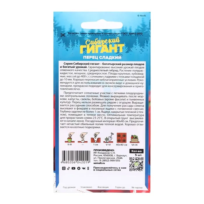 Серия Сибирский гигант - богатырский размер и богатый урожай. Гарантированно высокий урожай плодов отменного качества. Среднеспелый гибрид. Растение полураскидистое, мощное, среднерослое. Плоды крупные, кубовидные, массой до 400 г, с сочными сладкими стенками толщиной до 10 мм. Хорошо переносит неблагоприятные условия. Рекомендуется для использования в свежем виде и домашней кулинарии, прекрасно подходит для консервирования и приготовления лечо. Предпочитает солнечные участки с легкими плодородными нейтральными почвами. Можно выращивать после моркови, капусты, свеклы, бобовых (кроме фасоли) и тыквенных культур. Перец нельзя размещать рядом с огурцом. Выращивается рассадным способом. Для получения рассады семена высевают в феврале в посевные ящики с почвенной смесью. Глубина заделки не более 1 см. Ящики, накрытые пленкой (стеклом), помещают в теплое место. Оптимальная температура для прорастания семян 23-25°С. В открытый грунт высаживают в начале июня. Посадочный интервал 40х40 см. Предпочитает нечастый обильный полив теплой водой. Хорошо отзывается на азотные подкормки.
