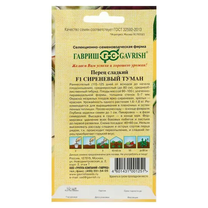 Среднеранний (115-125 дней от всходов до начала плодоношения), среднерослый (до 80 см), среднеоблиственный гибрид. Плоды массой 90-100 г, усечено-пирамидальной формы, толщина стенок 5-7 мм. Окраска плодов в технической спелости - ярко-сиреневая, при созревании - красная. Рекомендуется для выращивания в пленочных и остекленных теплицах. Посев на рассаду в конце февраля. Пикировка в фазе семядолей. Высадка в грунт в конце мая. Формировка: удаление всех боковых побегов и листьев до первой развилки. Схема посадки 40x60 см. Урожайность одного растения 1,6-1,8 кг.
