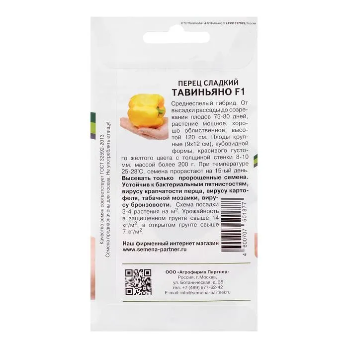Гибрид среднеранний. От высадки 50-65-и дневной рассады до созревания плодов 75-80 дней. Растение мощное, хорошо облиственное, высотой около 120-130 см. Плоды кубовидной формы, красивого густо-жёлтого цвета, крупные, длиной 9 см, диаметром 12 см, с толщиной стенки плода 8-10 мм, массой более 200 г. Рекомендуется для выращивания в открытом грунте и защищенном грунте. При температуре 25-28°C, семена прорастают на 15-й день. Гибрид устойчив к вершинной гнили плодов, вирусу табачной мозаики, толерантен к вертициллёзному увяданию. Высевать только пророщенные семена.