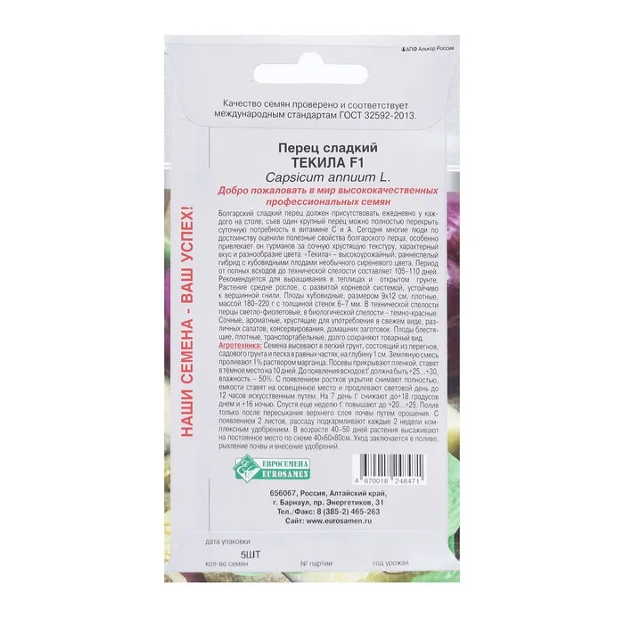 Перец сладкий Текила F1 — ультраранний гибридный сорт с периодом вызревания плодов 80−100 дней. Выращивается в открытом грунте и под пленочными укрытиями. Показывает повышенную резистентность к фузариозу и вершинной гнили. Плоды в стадии вызревания имеют зеленый цвет. К моменту сбора урожая приобретают необычный для болгарского перца насыщенный сиренево-бордовый окрас. Форма плодов — кубовидная, структура 4-камерная.Средний вес плода 160−170 граммов, длина 10−12 см, диаметр 8−9 см. Толщина стенок — 6−7 мм.