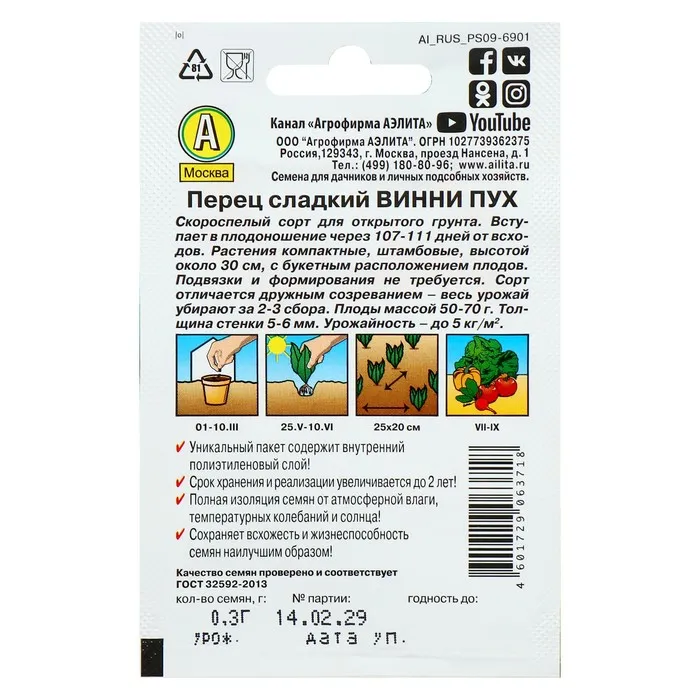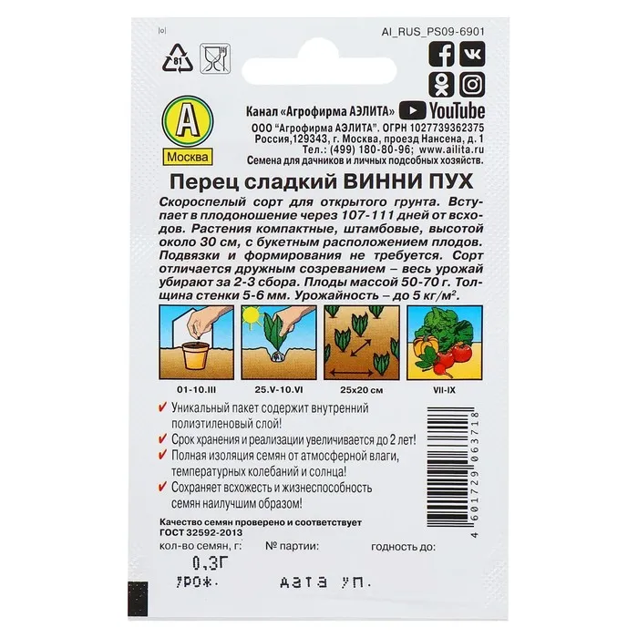 Скороспелый сорт рекомендован для открытого грунта и теплиц. Период от всходов до технической спелости составляет 107–111 дней. Растения компактные, штамбовые, высотой около 30 см, малооблиственные, с букетным расположением плодов. Сорт отличается дружным созреванием — весь урожай убирают за 2–3 раза. Перцы конусовидной формы, гладкие, сочные, ароматные, массой 50–70 г. Толщина мякоти околоплодника — 5–6 мм. Плоды лёжкие, транспортабельные, универсального использования. Растения выносливы к вертициллёзу. Урожайность — до 5 кг/м².