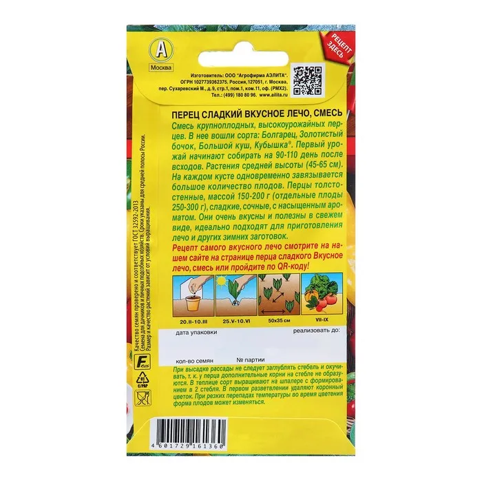 Семена Перец сладкий Вкусное лечо, смесь Блюда стран мира Ц/П 20шт — Характеристики