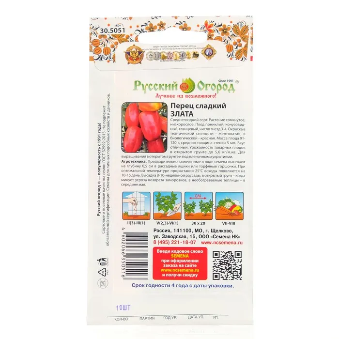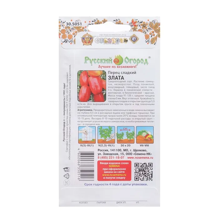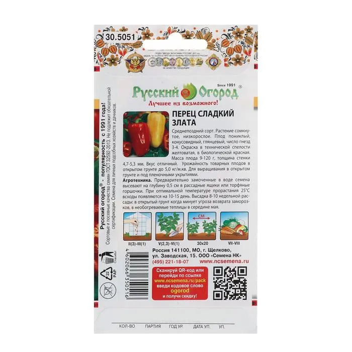 Среднепоздний сорт. Растение сомкнутое, низкорослое. Плод пониклый, конусовидный, глянцевый, число гнезд 3-4. Окраска в технической спелости желтоватая, в биологической - красная. Масса плода 91-120 г, толщина стенки 4,7-5,3 мм. Вкус отличный. Урожайность товарных плодов в открытом грунте до 5,0 кг/м.кв. Для выращивания в открытом грунте и под пленочными укрытиями.