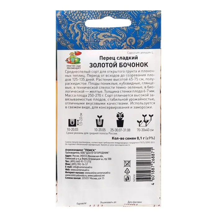 Среднеспелый сорт для открытого грунта и пленочных теплиц. Период от всходов до созревания плодов 125-135 дней. Растение высотой 45-75 см, полураскидистое. Плоды пониклые, кубовидные, глянцевые, в технической спелости темно-зеленые, в биологической — желтые. Толщина стенки плода 6-7 мм. Масса плода 250-270 г. Сорт отличается высокой завязываемостью плодов, стабильной урожайностью, отличными вкусовыми качествами. Используется в свежем виде, для консервирования и заморозки.