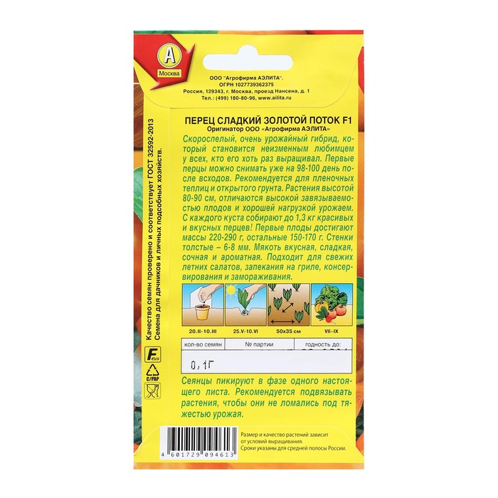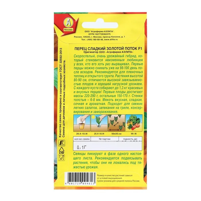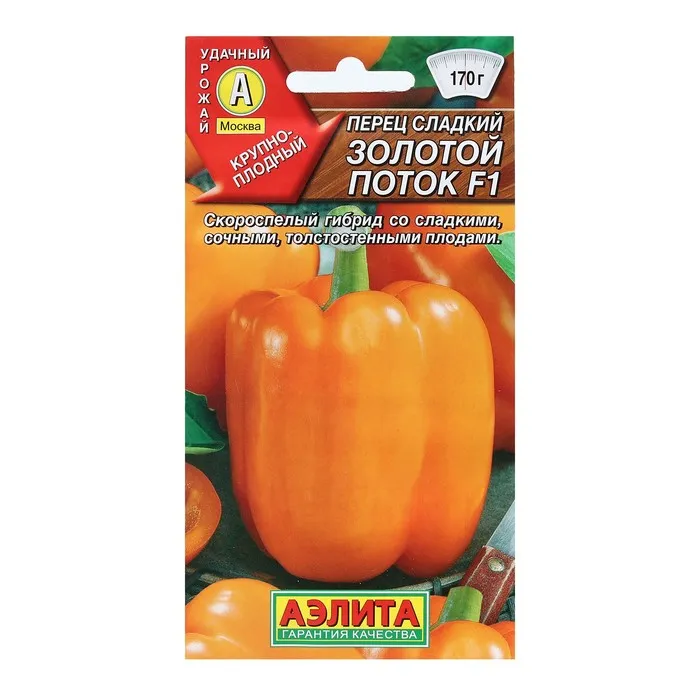 Скороспелый гибрид, вступает в плодоношение через 98-100 дней от массовых всходов. В условиях средней полосы рекомендуется для теплиц, в южных регионах – для открытого грунта. Растения штамбовые, 80-90 см высотой, с кубовидными оранжевыми перцами массой 150-170 г. Товарная урожайность 6-7 кг/м2. Толстостенные (7 мм), сочные, ароматные плоды вкусны в свежем виде, в блюдах с легкой термической обработкой и в зимних заготовках. Очень привлекательно выглядят на кусте и на столе.