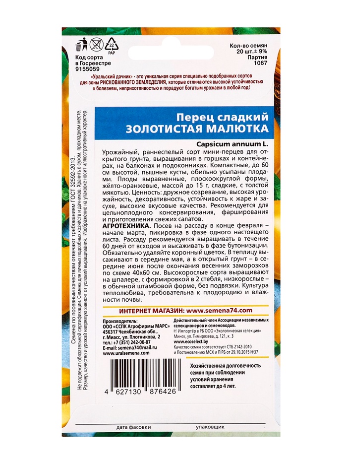 Семена Перец "Золотистая Малютка", 20 шт — Характеристики